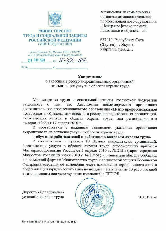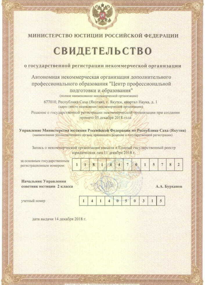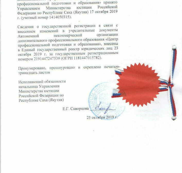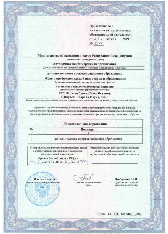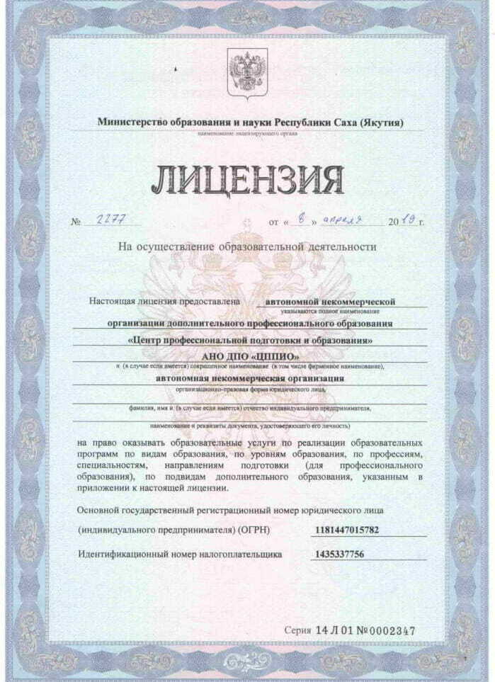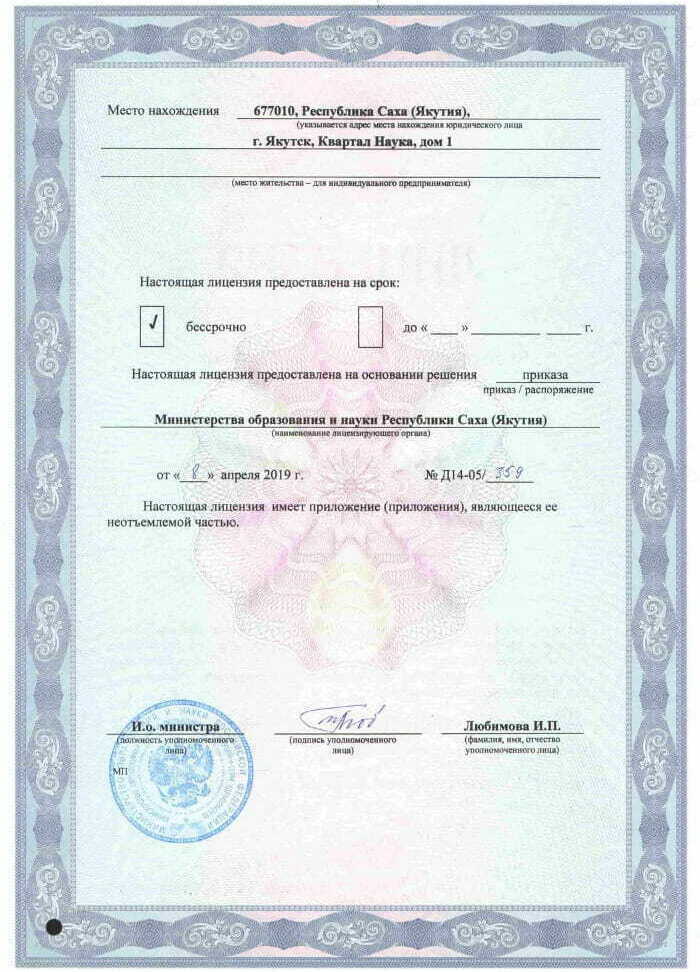 Лицензия на образовательную деятельность №2277 от 08.04.2019 г. выданная Министерством образования и науки Республики Саха (Якутия)